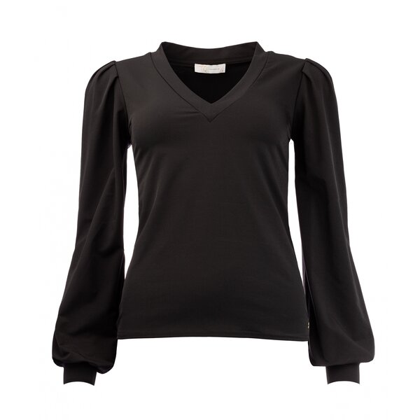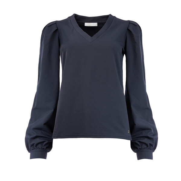 Vrouwelijke travel top met V-hals en lange pofmouwen