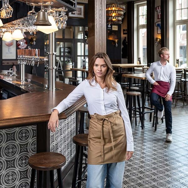 Het sloofje is voorzien van een handige zak die in drieën is gedeeld, waardoor je eenvoudig pennen, notitieblokjes of bestellijsten kunt meenemen. De sloof is verkrijgbaar in maar liefst 21 verschillende kleuren, zodat hij perfect aansluit bij de huisstijl van jouw horecazaak.