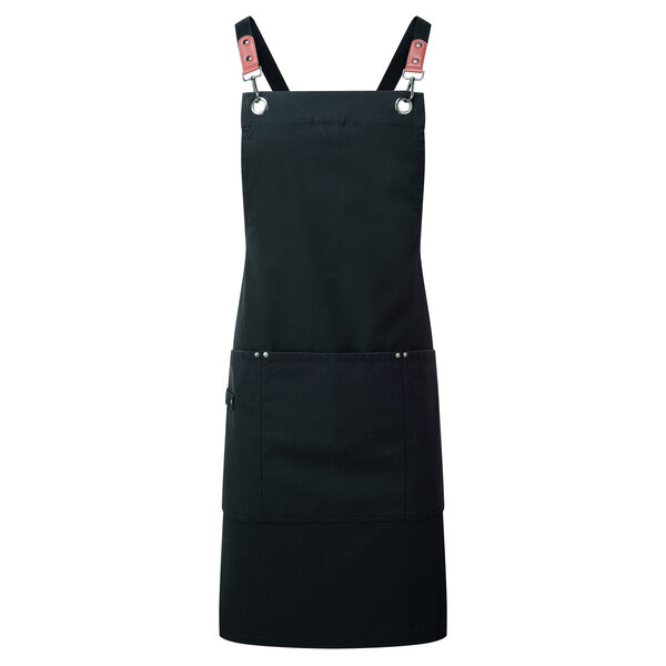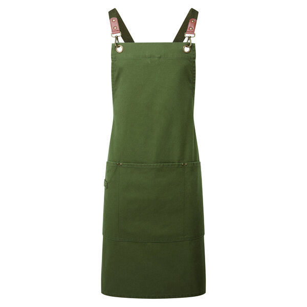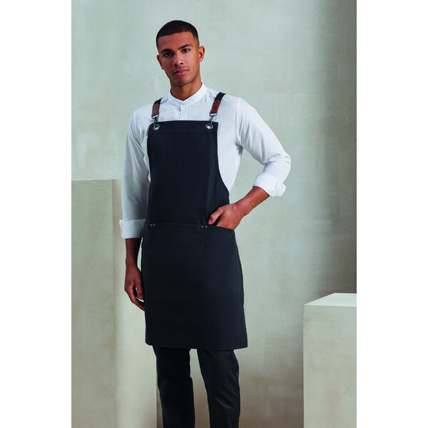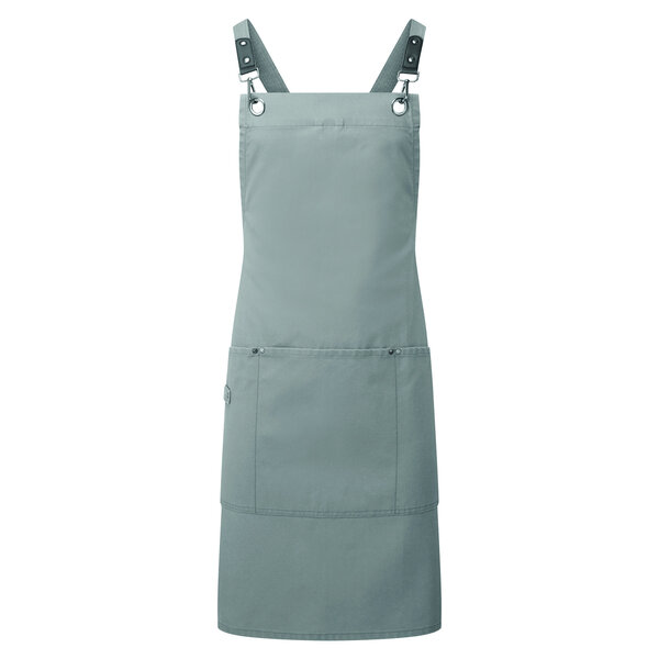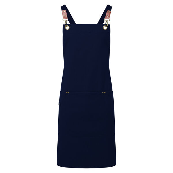 De schouderbanden zijn uitgevoerd in een effen gekleurde visgraatstof en worden met stevige sluitingen bevestigd aan metalen oogjes. Dit CLIP ’N’ CLASP-systeem zorgt ervoor dat het schort eenvoudig aan en uit te trekken is en goed op zijn plek blijft zitten tijdens het werk.