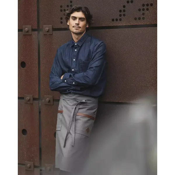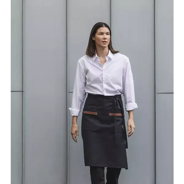 De twee ruime voorzakken zijn afgewerkt met afwasbare kunstlederen details: stijlvol en makkelijk schoon te houden. Zo heb je altijd voldoende ruimte voor notitieblokjes, pennen of keukengerei, terwijl de sloof representatief blijft ogen.
